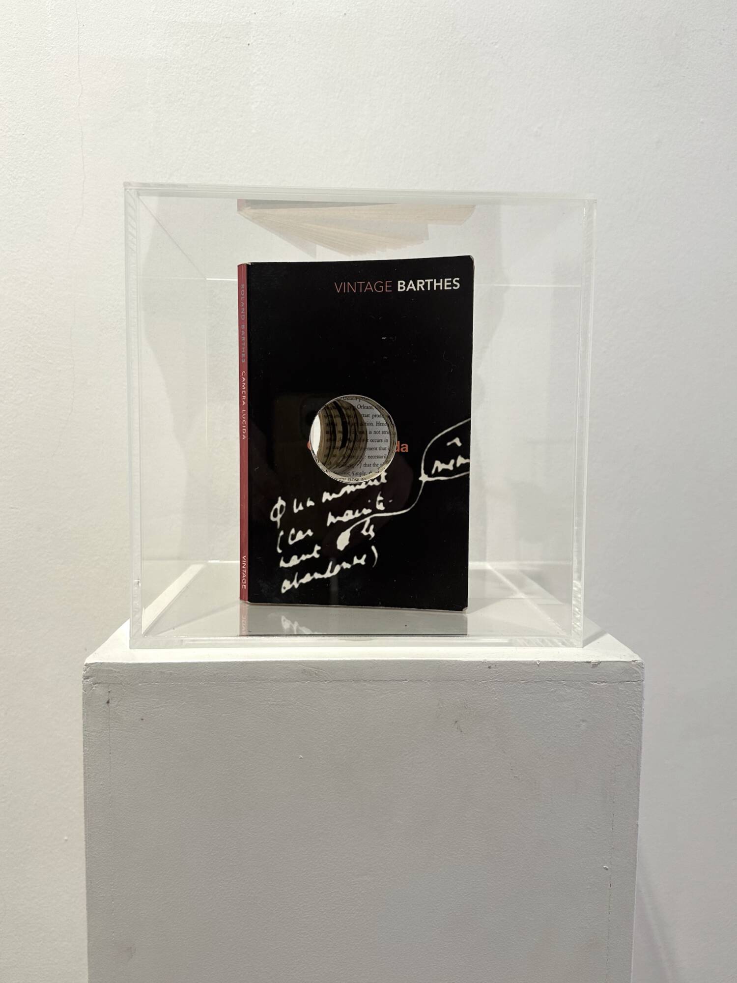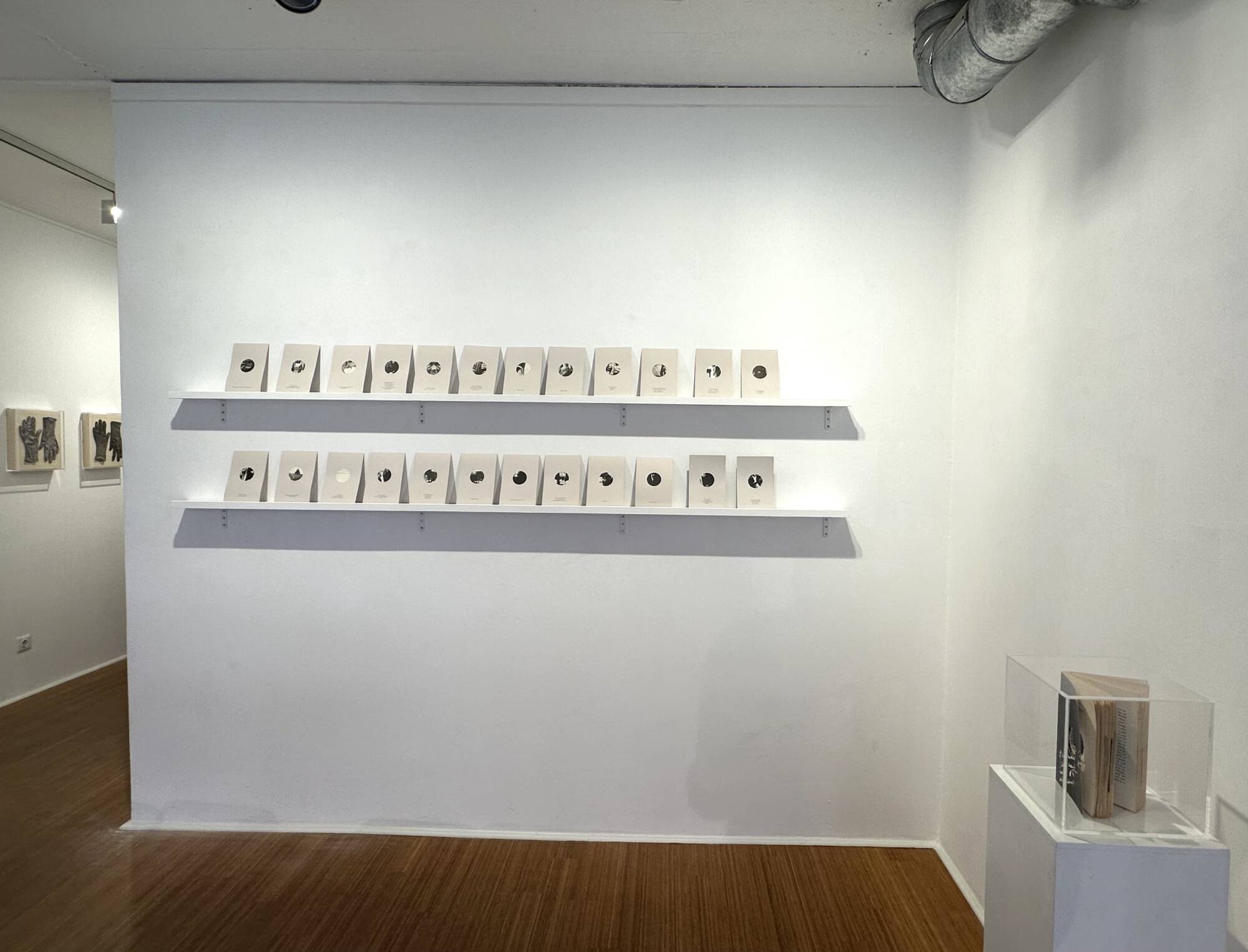 At the center of the exhibition is the Entropy Pendulum (2015), a specially constructed apparatus that continuously sets a pendulum in motion. As it swings, the pendulum’s abrasive weight scrapes across 36 individual photographs from the artist’s archive, gradually wearing them down. This slow erosion inscribes itself into the image surface as both presence and loss.
